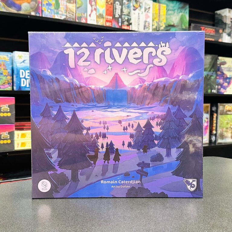 You are the leader of a tribe whose people explore the fabled twelve rivers flowing from a mystical lake high in the mountains. Your goal? To find the magical coloured pearls that roll down the rivers in the current. Perhaps a helpful fairy may help you on your quest! Where the rivers converge there is a village where many people and animals live in harmony. There you can make life-long friends and deliver the pearls you have collected, to be used to heal, grow, and ensure another prosperous year for all. In each of 5 rounds of play, take turns paying camp cards (resources) to place your 3 tribe tokens into various slots along the rivers, to get the magic