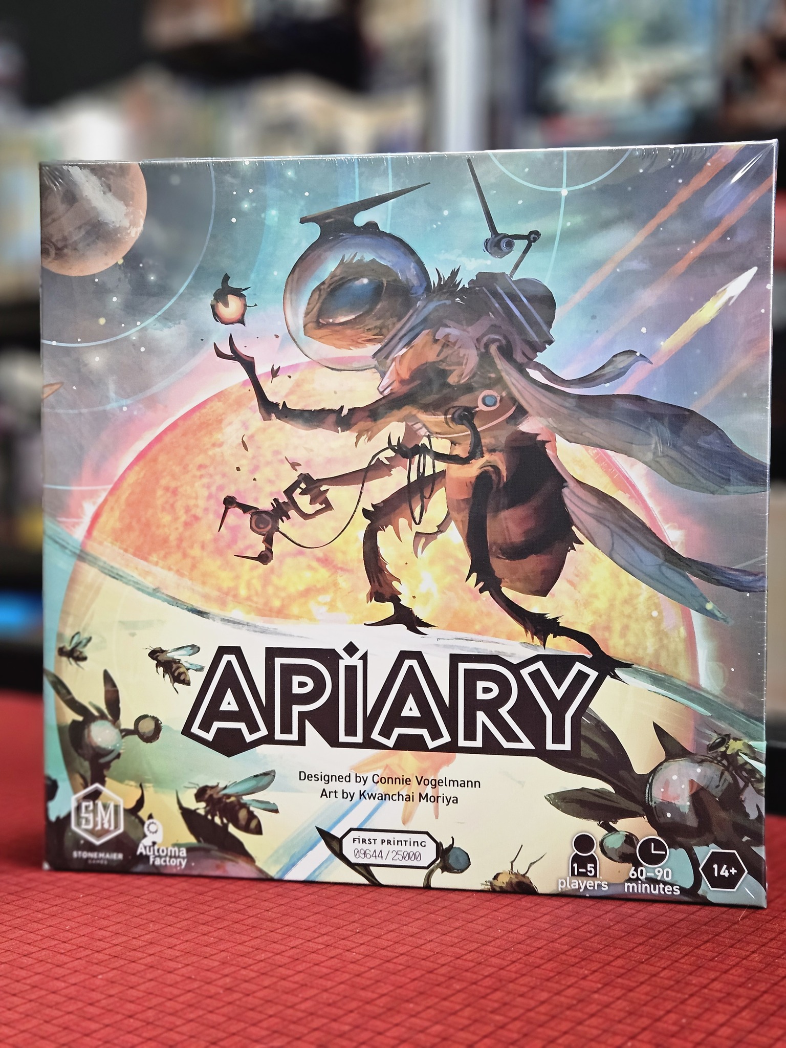 In Apiary, each player controls one of twenty unique factions. Your faction starts the game with a hive, a few resources, and worker bees. A worker-placement, hive-building challenge awaits you: explore planets, gather resources, develop technologies, and create carvings to demonstrate your faction’s strengths (measured in victory points) over one year’s Flow. However, the Dearth quickly approaches, and your workers can take only a few actions before they must hibernate! Can you thrive or merely survive?