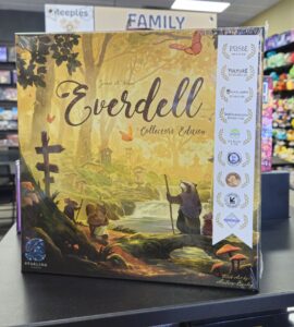 The Collector’s Edition of Everdell includes everything in the standard edition, plus the 10 card Legends expansion, 15 Extra! Extra! cards, 30 metal tokens, and an upgraded 8-sided die. This