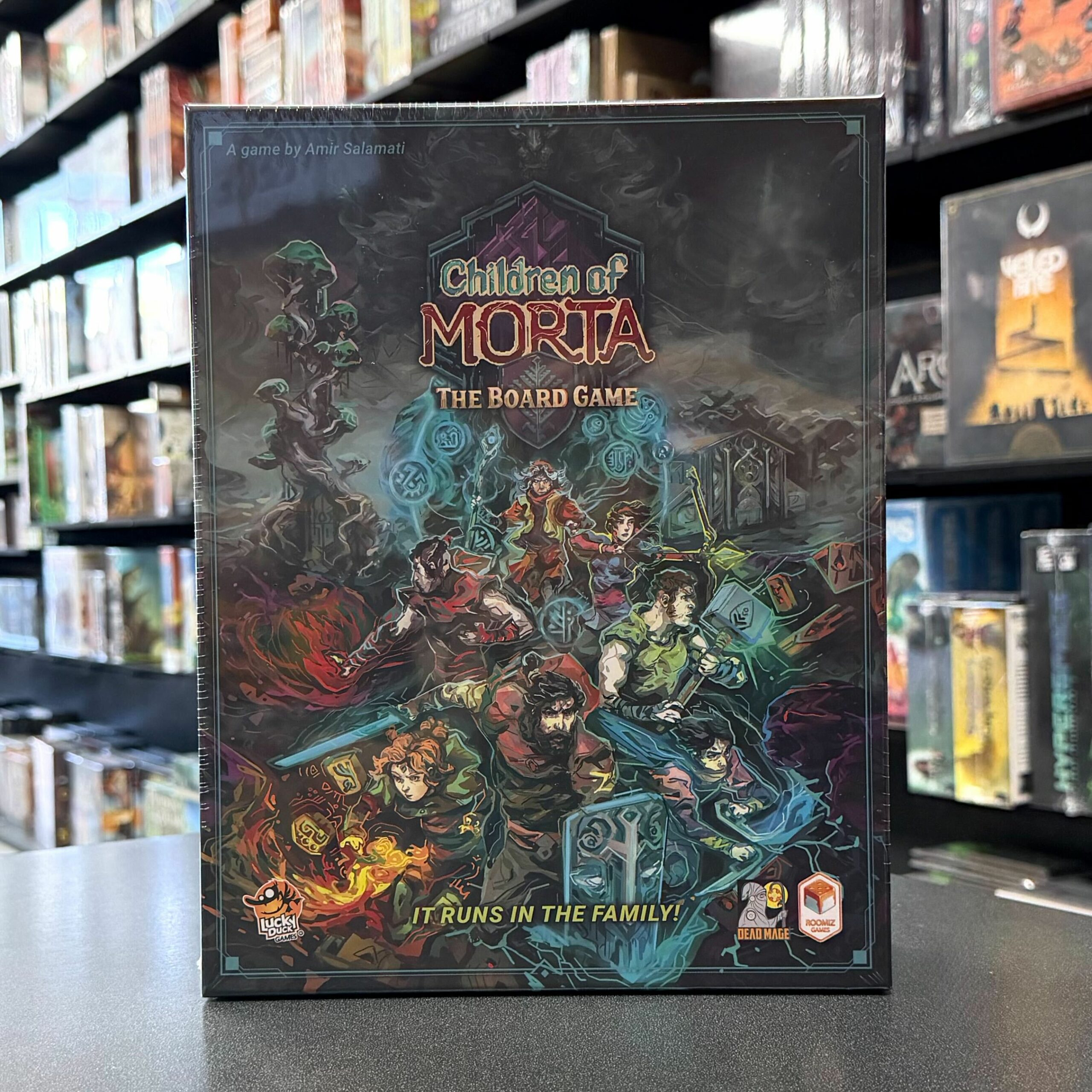 Children of Morta: The Board Game is a cooperative adventure game with a unique shared bag-building mechanism, permanent character development, an emphasis on family growth, simultaneous turns, and interconnected cooperation. A family unites against the wicked corruption spreading in their beloved land! A family that SLAYS together, STAYS together!
