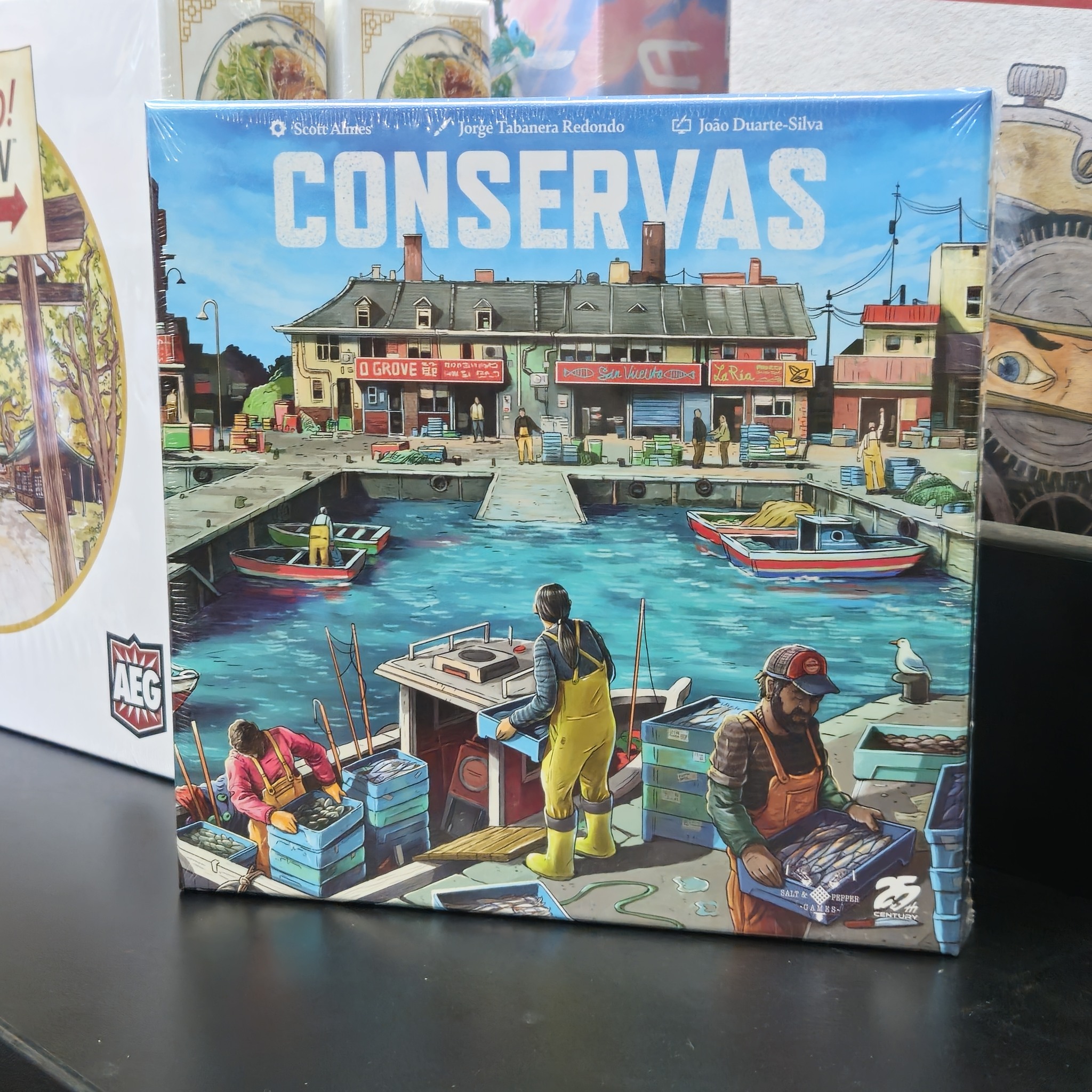 In each game of Conservas, you begin each season with a single boat and a little money. The sea is represented by a bag of chits full of fish and water tiles. In each round, you will fish from this bag, taking some back to your facility for tinning while leaving others at sea to breed.