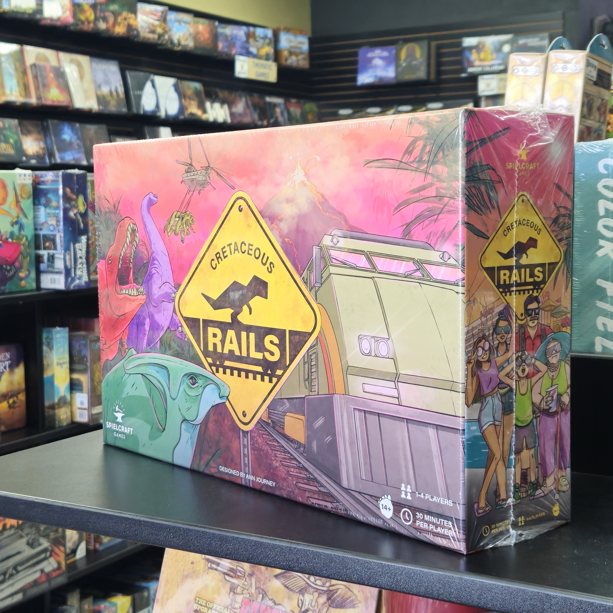 Cretaceous Rails features an innovative dual-action worker placement system, route building, tableau building, and resource management. Utilize the resources of the Cretaceous jungle to build the optimal combination of attractions for abilities and scoring.