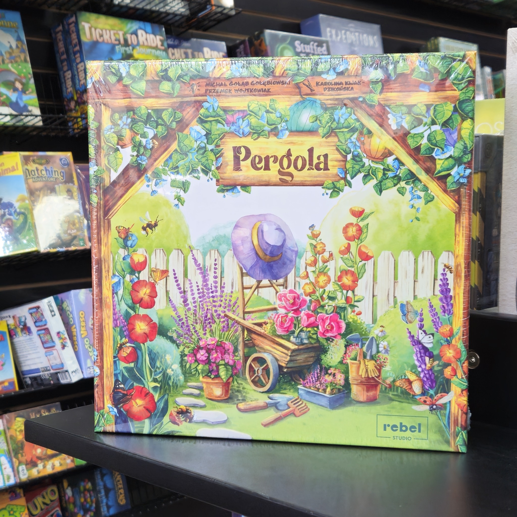 In Pergola, players develop their gardens, grow new plants, and attract insects and small animals. On their turn, a player chooses one of the four available tools, picks the presented items, and arranges them in their garden. Then they perform the action corresponding to the chosen tool. Since players have a lot of freedom in arranging plants in their gardens, after fifteen rounds each garden looks completely different and scores differently. The player who accumulates the most points wins.