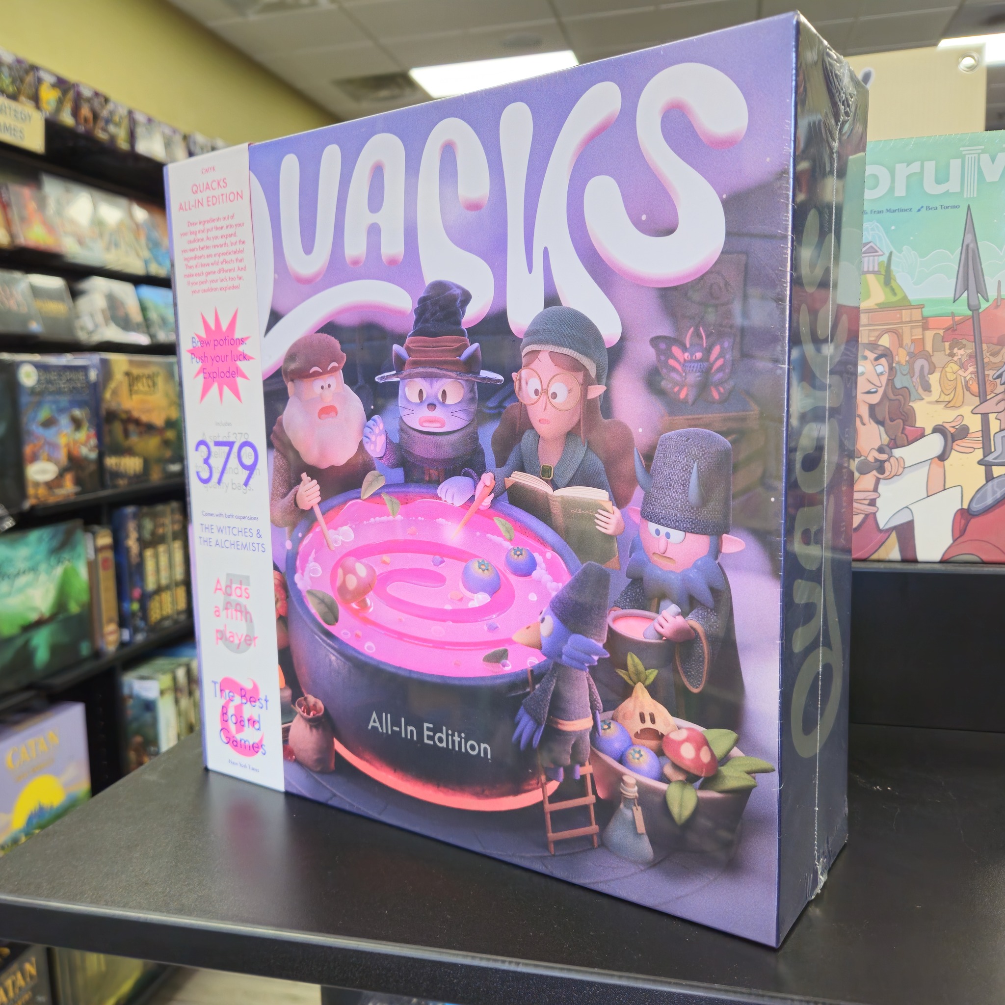 Quacks: All-In Edition includes the original The Quacks of Quedlinburg base game, as well as two expansions previously released separately — The Witches and The Alchemists — as well as deluxe components.