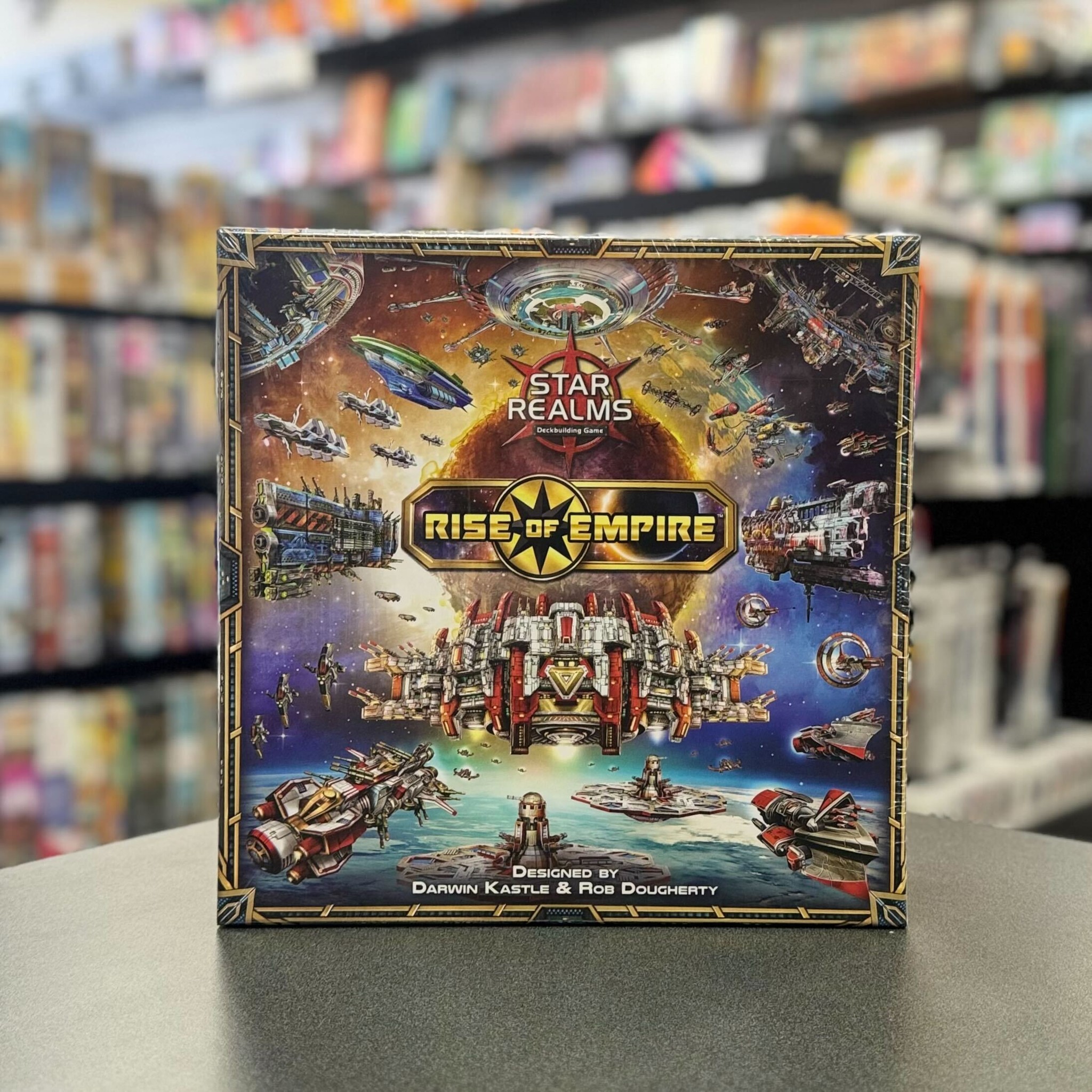 Star Realms: Rise of Empire is a new standalone pre-quel to the popular Star Realm series game with 141 cards, and a 12-game legacy scenario campaign. Rise of Empire introduces three brand new factions: the Consortium, the Scavengers, and the Kingdom. Rise of Empire will take players on an epic adventure over the course of 12 scenarios where players will permanently alter the market deck cards while tracking their battle wins and losses. Players will compete to achieve various objectives, earning them Campaign Victory Points and unlocking the secrets of the worlds around them. Rise of Empire can be played stand-alone or combined with all previous Star Realms content after you’ve finished the campaign.