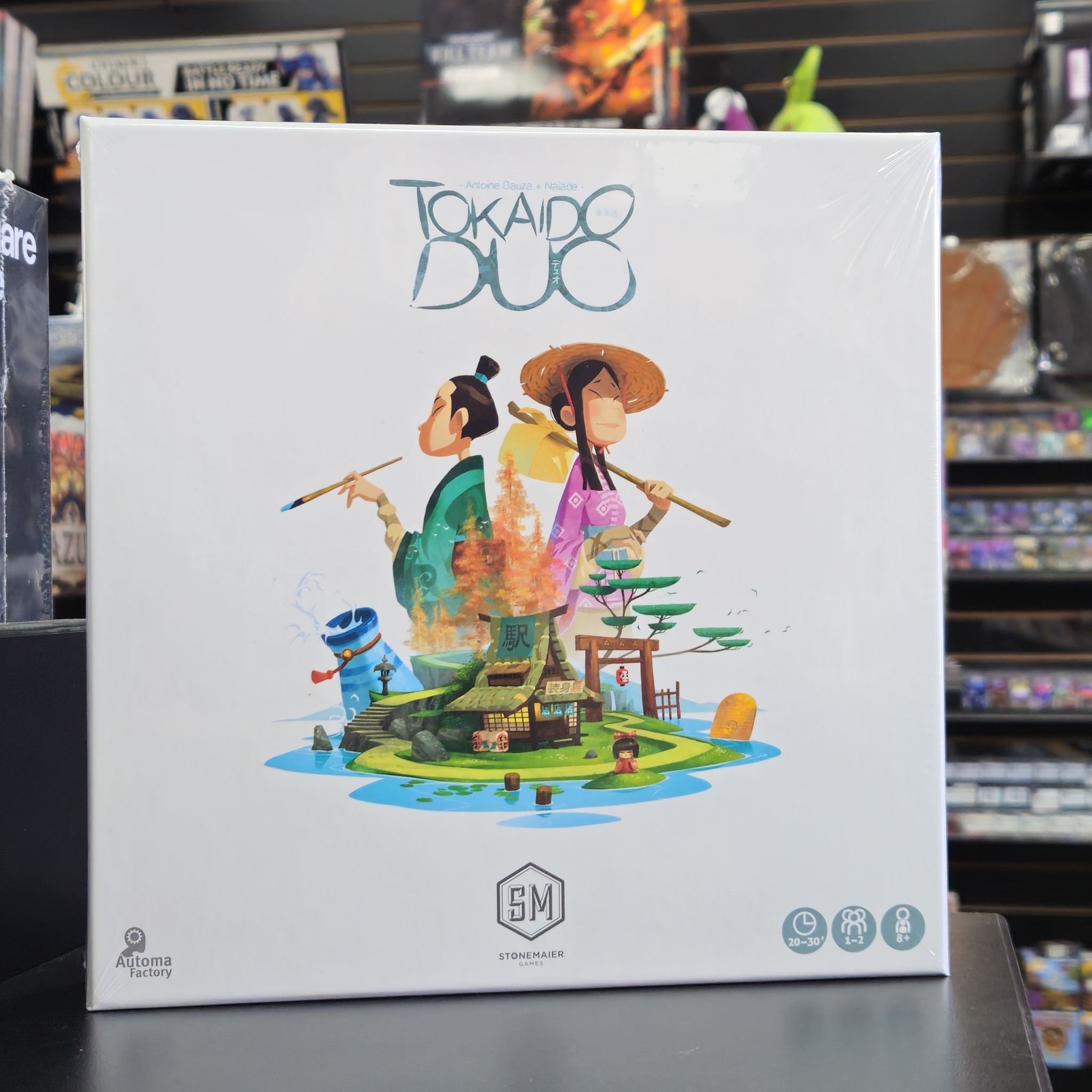 Welcome, travelers, to the Japanese island of Shikoku! Tokaido Duo is a standalone game inspired by Tokaido but featuring completely new mechanisms. 1-2 players use a quick dice draft each turn to steer three unique characters on different tracks around the smallest of Japan’s main islands.